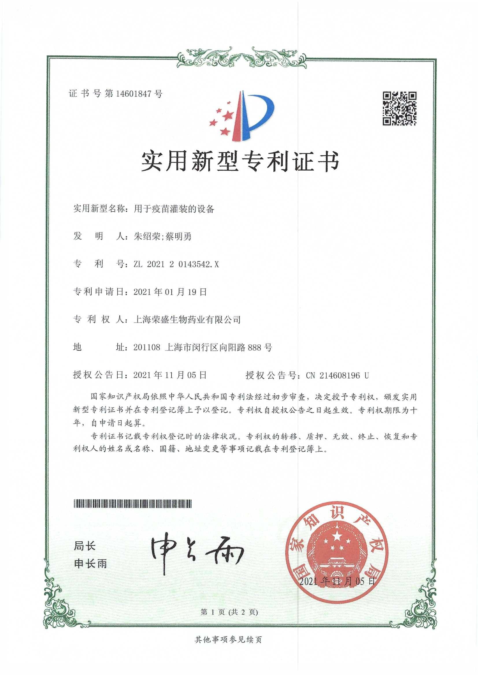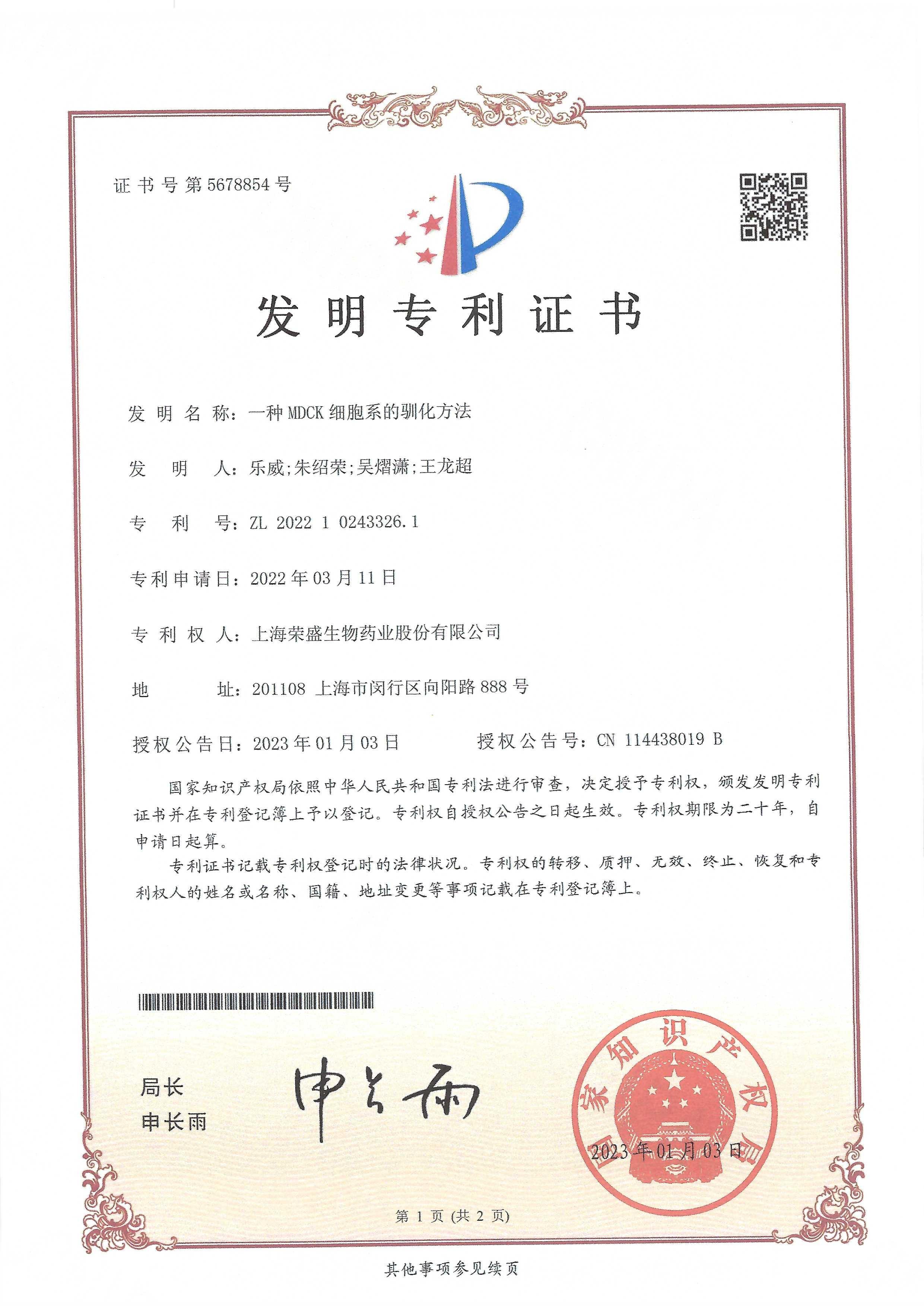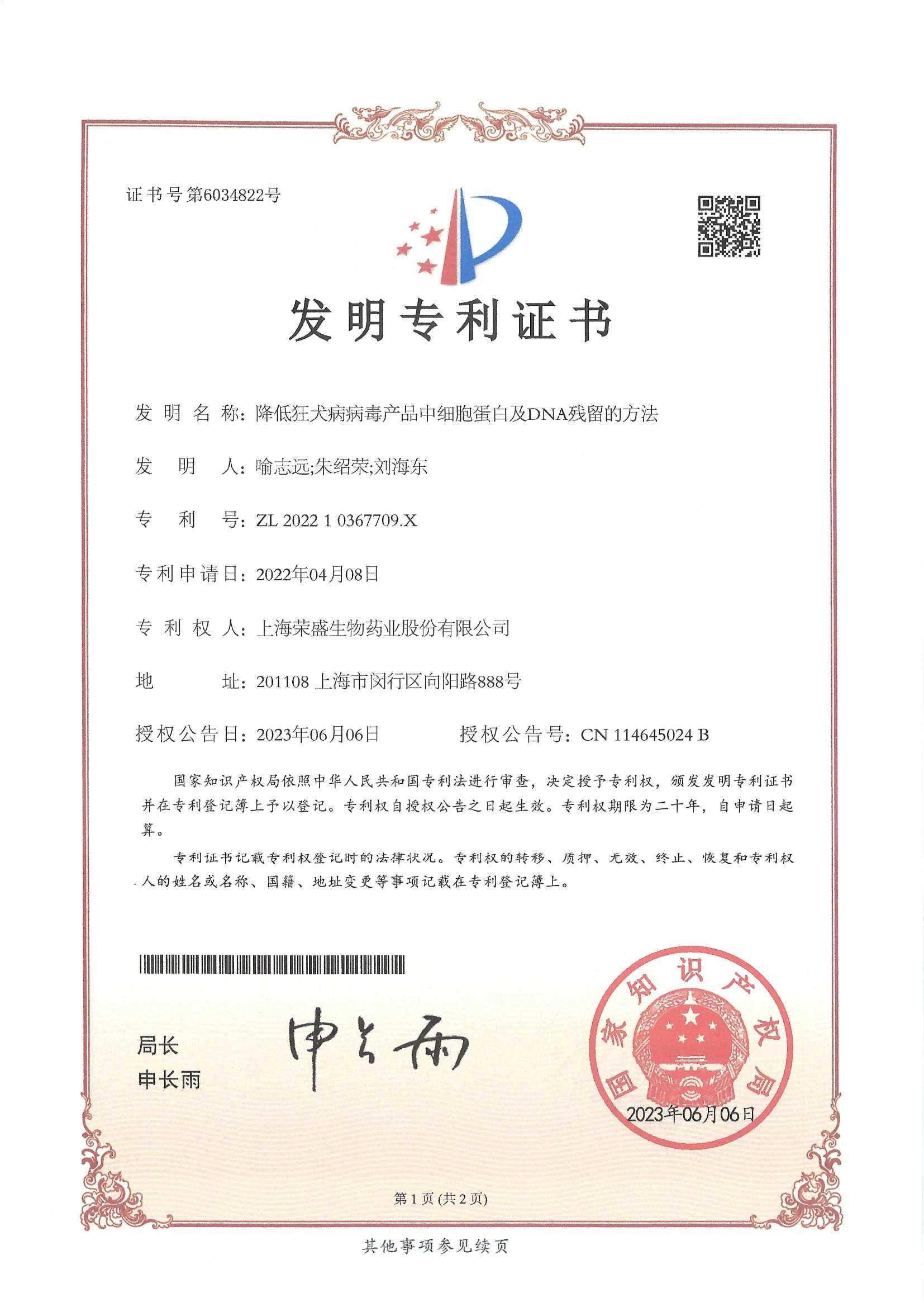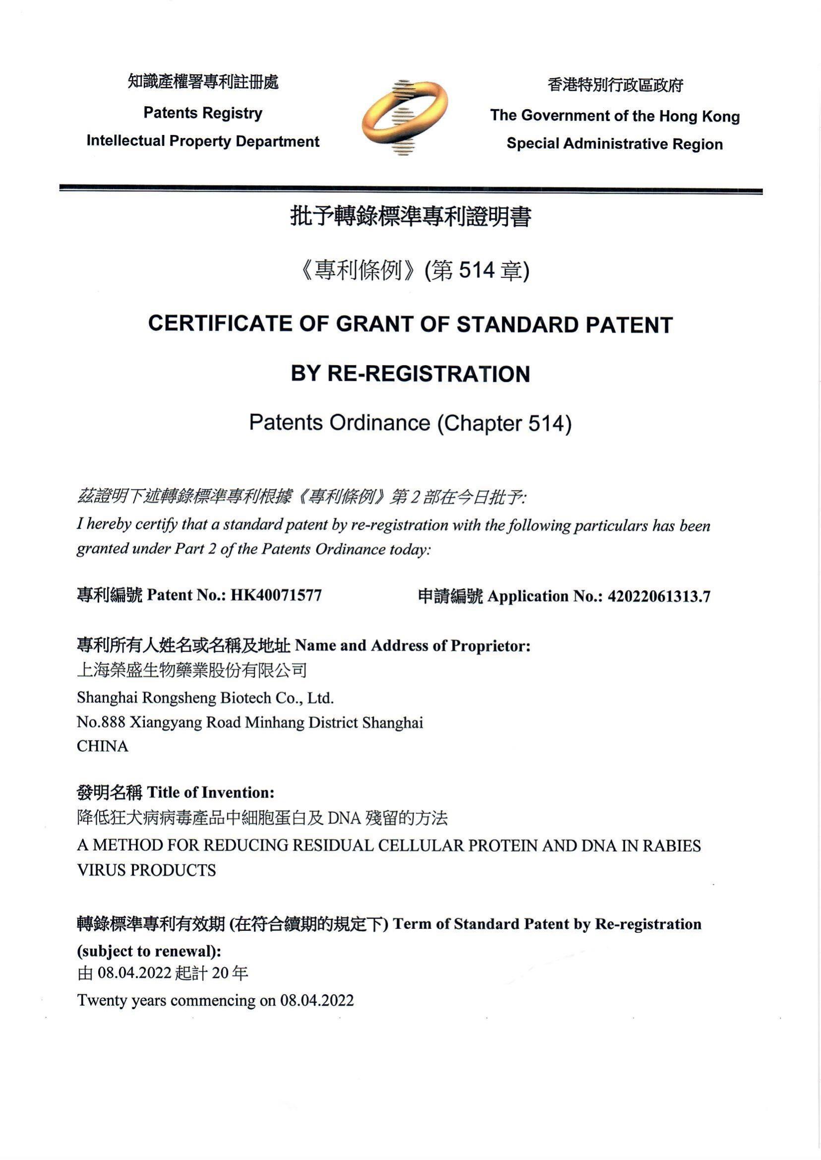 降低狂犬病病毒產(chǎn)品中細(xì)胞蛋白及DNA殘留的方法香港專(zhuān)利證書(shū)第一面